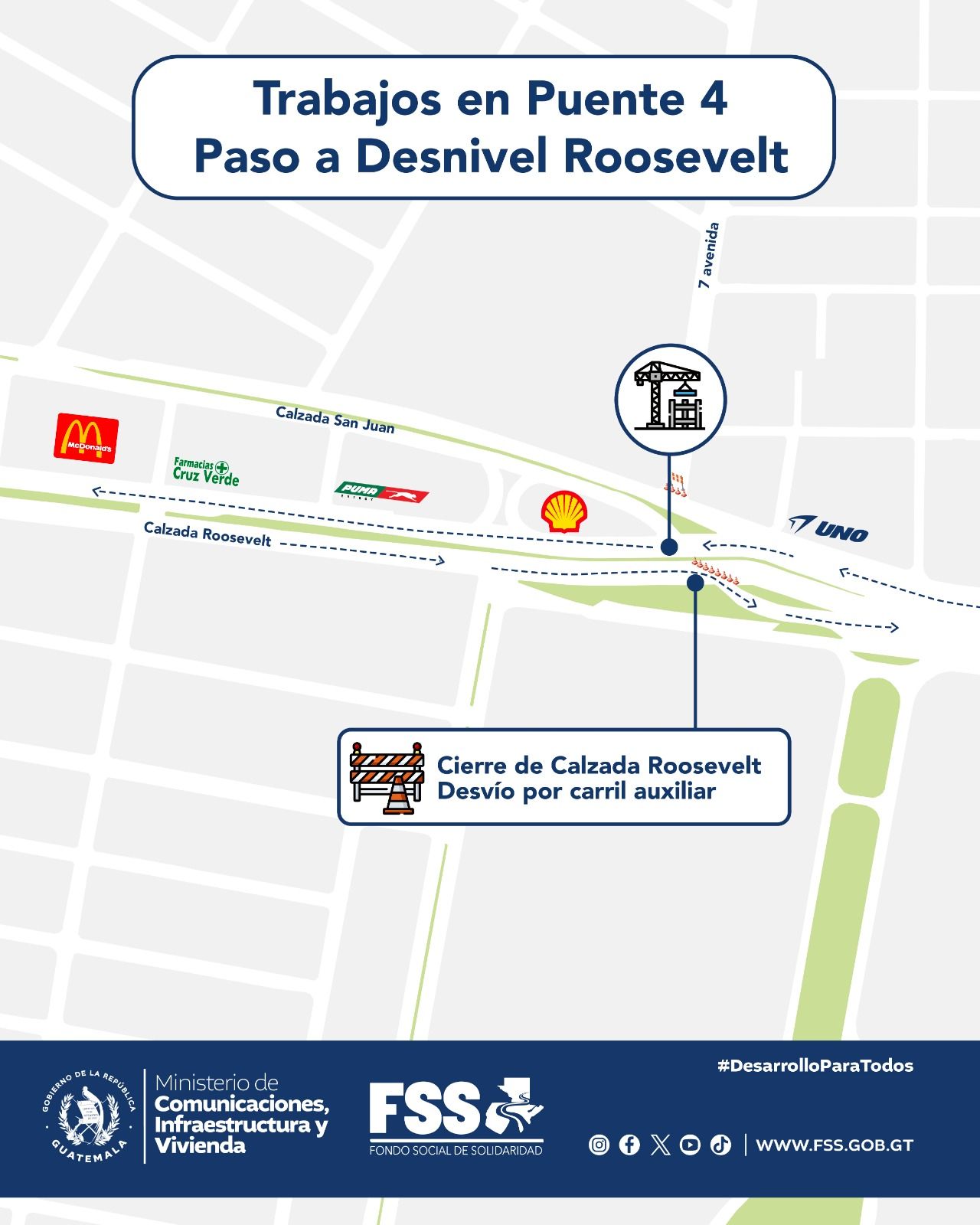 건설통신부(CIV)는 Roosevelt 도로에서 진행 중인 고가도로 공사로 인해 11월 26일부터 28일까지 Trébol 방향 차선에 야간에만 부분 폐쇄가 이뤄질 것이라고 밝혔다.